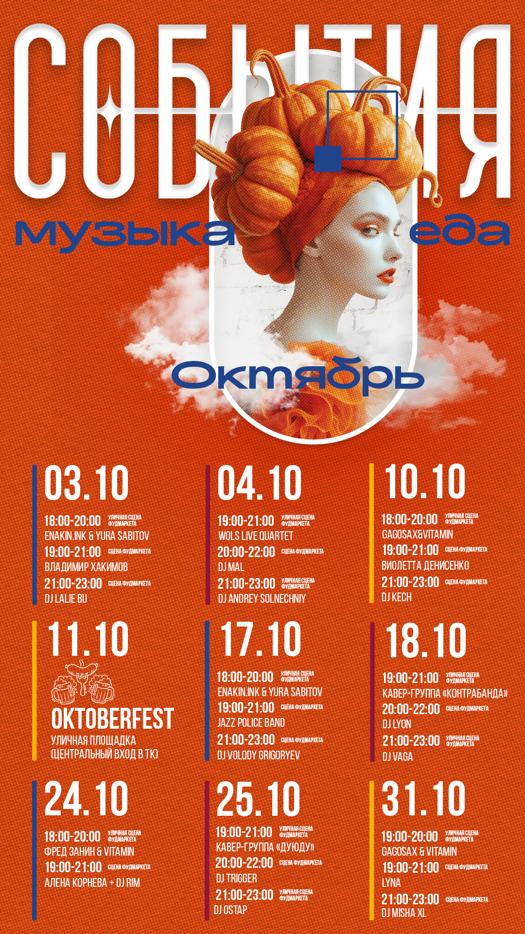 В этом октябре "Фудмаркет Центр Города" превращается в эпицентр музыкальной жизни. Мы подготовили для вас грандиозный календарь событий, где каждые выходные — это новая история, новый ритм и незабываемые эмоции.